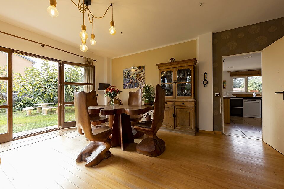 A la planta baixa hi trobem la cuina oberta al menjador amb accés al jardí, un saló també amb sortida a l'exterior i una habitació per a despatx o dormitori doble i un bany.